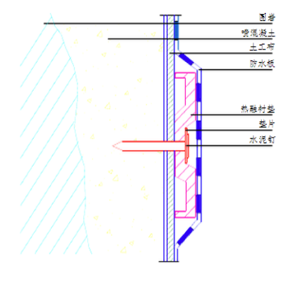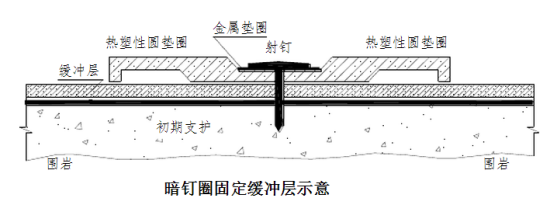6.1.4.分离式防水板铺挂前,用带热塑性圆垫圈的射钉将缓冲层平整顺直地固定在基层上(见下图),缓冲层搭接宽度50mm,可用热风焊枪点焊,每幅防水板布置适当排数垫圈,每排垫圈距防水板边缘40cm左右,垫圈间距:侧壁80cm,2~3个垫圈/m2,顶部40cm,3~4个垫圈/㎡。