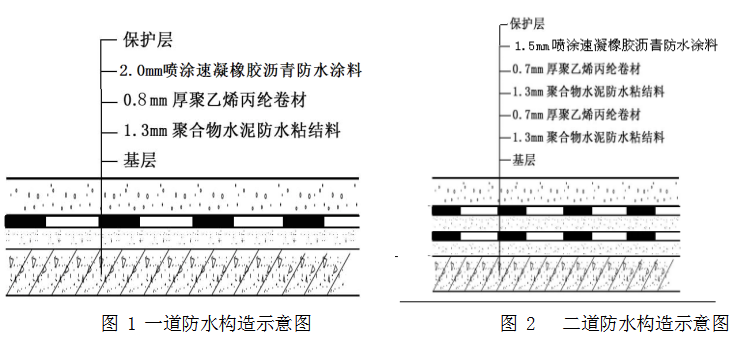 聚乙烯丙纶防水卷材与喷涂速凝橡胶沥青防水涂料复合防水一道防水构造见图1,聚乙烯丙纶防水卷材与非固化橡胶沥青防水涂料复合防水二道防水构造见图2