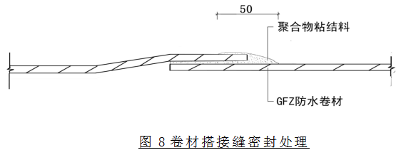 接缝搭接应粘接牢固,用聚合物防水粘结料覆盖、密封,防止翘边和开裂。卷材搭接缝密封处理见图8