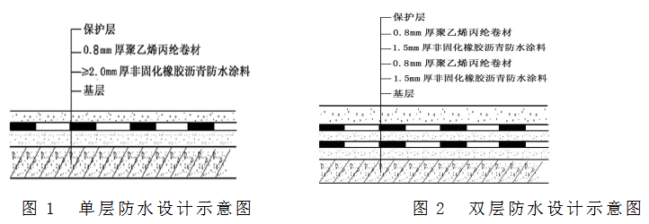 聚乙烯丙纶防水卷材与非固化橡胶沥青防水涂料复合防水一道防水构造见图1,聚乙烯丙纶防水卷材与非固化橡胶沥青防水涂料复合防水二道防水构造见图2.
