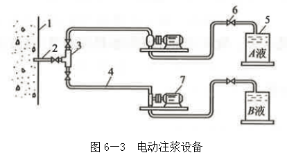 1—结构物;2—注浆嘴;3—混合室;4—输浆管;5—贮浆罐;6—阀门;7—电动泵