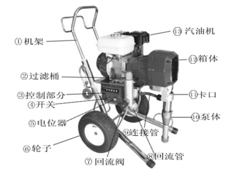 汽油机引擎驱动高压无气喷涂机。该设备马力强劲,在喷涂防水涂料等高粘度材料时,可以轻而易举的得到平涂的效果和橘皮效果。当然,该设备也适合喷涂几乎所有种类的底漆、面漆和一般涂料。