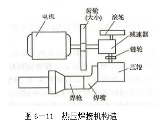 热压焊接法是将两片PVC防水卷材搭接40~50mm,通过焊嘴热风加热,利用聚氯乙烯材料的热塑性,使卷材的边缘部分达到熔融状态,然后用压辊加压,将两片卷材融为一体。热压焊接机构造如图6—11所示。