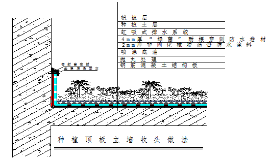 5.1.7立墙收头处理:立面上返高度超过顶板的覆土,由于上返部位是防水薄弱环节,因此应着重进行处理,添加辅助材料辅助工具进行加强。本方案制定采用金属压条固定钉加强,收头部位整体采用与大面相容性沥青类密封膏全部密封处理,侧墙防水应进行保护层设置,保护层宜采用排水板。