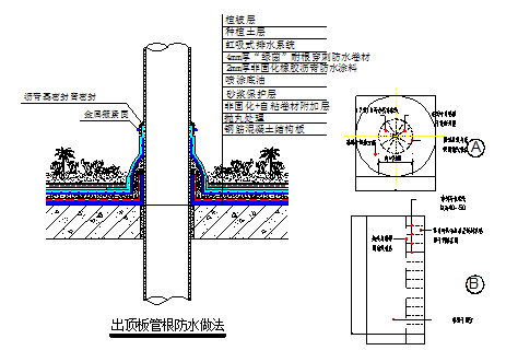 5.1.5顶板管根防水:首先确保在基层处理完毕,管根根部填堵坚实基础上进行,先将非固化在管根四周及上部进行涂刷,厚度2mm,随后复合交叉层压膜卷材1.5mm和其进行复合,达到对管根防水节点加强处理的目的。