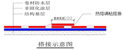 5.1.3搭接缝的处理做法,防水施工时,卷材长短边搭接宽度均为100mm,搭接缝采用热熔法进行处理,搭接部位必须保证搭接长度,热熔满粘。
