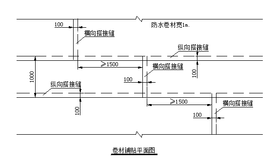 5.1.2卷材的铺贴:卷材施工时,相邻两幅卷材的搭接要错开,错开长度不小于1500mm,搭接长度为不小于100mm,平面搭接以及立墙搭接如下示意图所示: